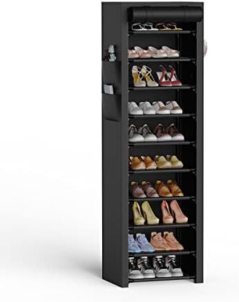 VTRIN Vertical Narrow Shoe Rack Organizer Tall Shoe Rack for Closet Entryway 10 Tier Non-Woven Cover Shoe Shelf Holds 20-22 Pairs Free Standing Shoe Storage Cabinet with Dustproof Cover Black