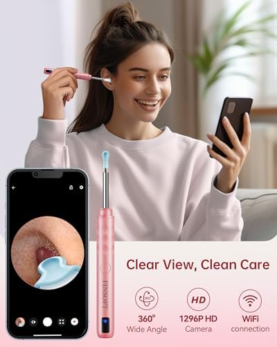 Ear Wax Removal Tool Camera, Ear Cleaner with Camera, Ear Wax Removal Cleaning Kit with 1296P HD Camera and 6 LED Lights, Earwax Removal Kit with 10 Ear Pick for iOS and Android, Coral Pink