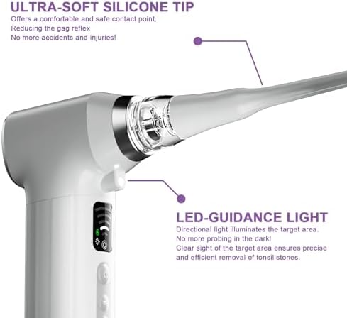 Built-in LED guide light: Featuring a high-intensity shadow-free lamp, our tonsil stone remover vacuum kit ensures clear visibility, eliminating the need to worry about shadows blocking your view. This enhances precision and safety, making it more easy and convenient to operate