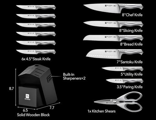 Full Tang Knife Set: Set includes 8″ chef’s knife, 8″ bread knife, 8″ slicing knife, 7″ Santoku knife, 5″ utility knife, 3.5″ paring knife, 6 pcs 4.5″ serrated steak knife, 1 kitchen shears, and modernist wooden knife block with 2-in-1 knife sharpener