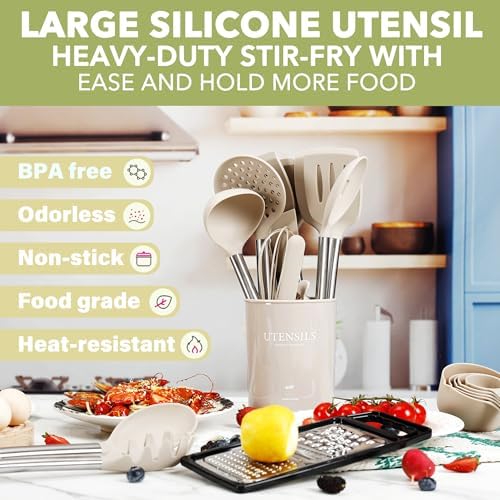 35 PCS KITCHEN UTENSILS SET WITH HOLDER: This utensil set includes all the utensils you need to cook the perfect dish, so you don’t have to spend a fortune buying each utensil separately. Includes a slotted spoon, soup ladle, spatula, pasta server, cheese grater, masher, scissors, ice cream scoop, pizza cutter and more. If you’re just starting out with your own home or want to get rid of worn out cooking utensils, we offer a complete line of premium kitchen essentials for your new home.